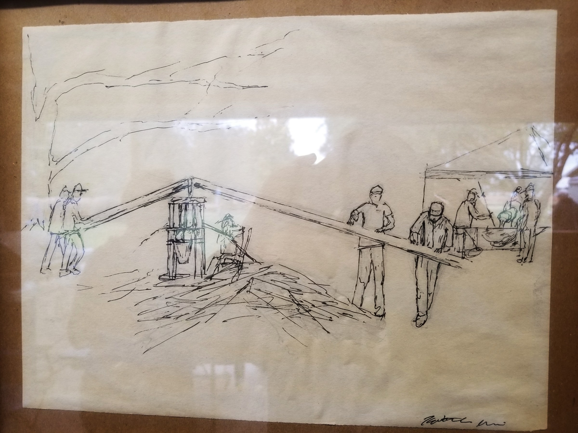 The morning started with a trailer-load of donated sugar cane stalks from a local farmer and friend of the family. Before the process can begin, each stalk must be stripped bare of it’s long, sharp leaves and placed in a neat pile near the mill. Nothing from the plant goes to waste. The leaves and the bagasse leftover from the extraction process goes back into the land in the form of mulch for the several oak trees that pepper the property.